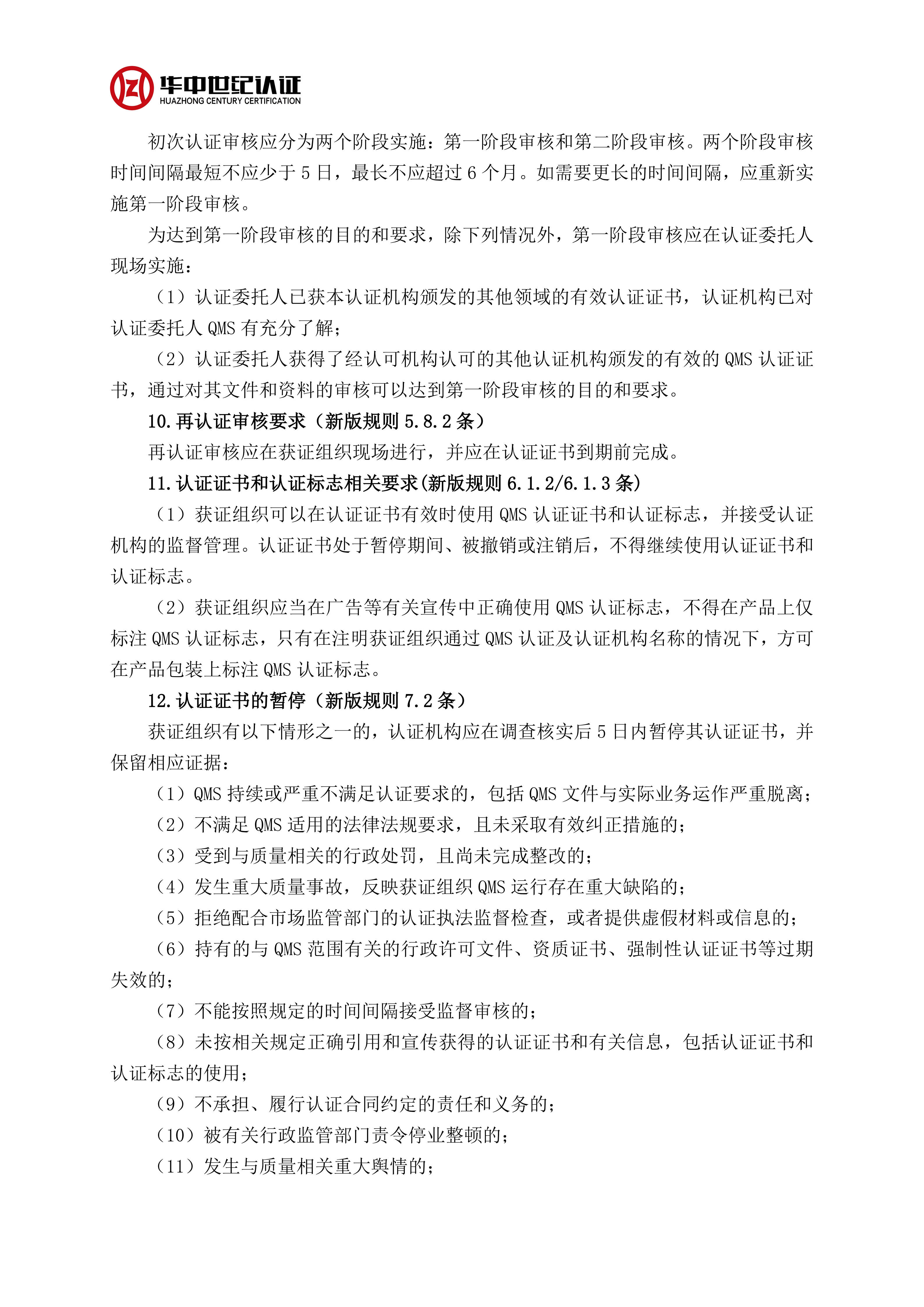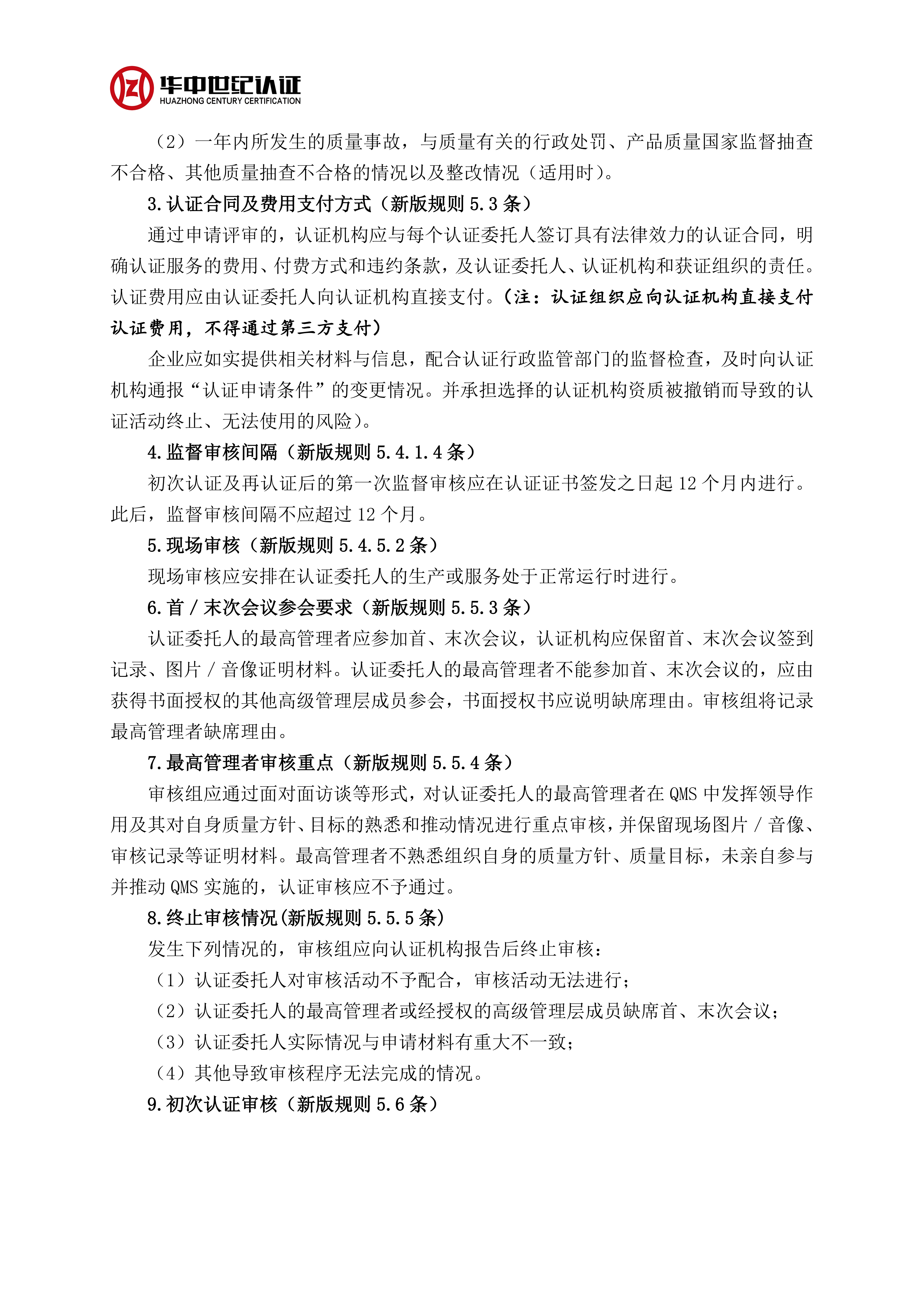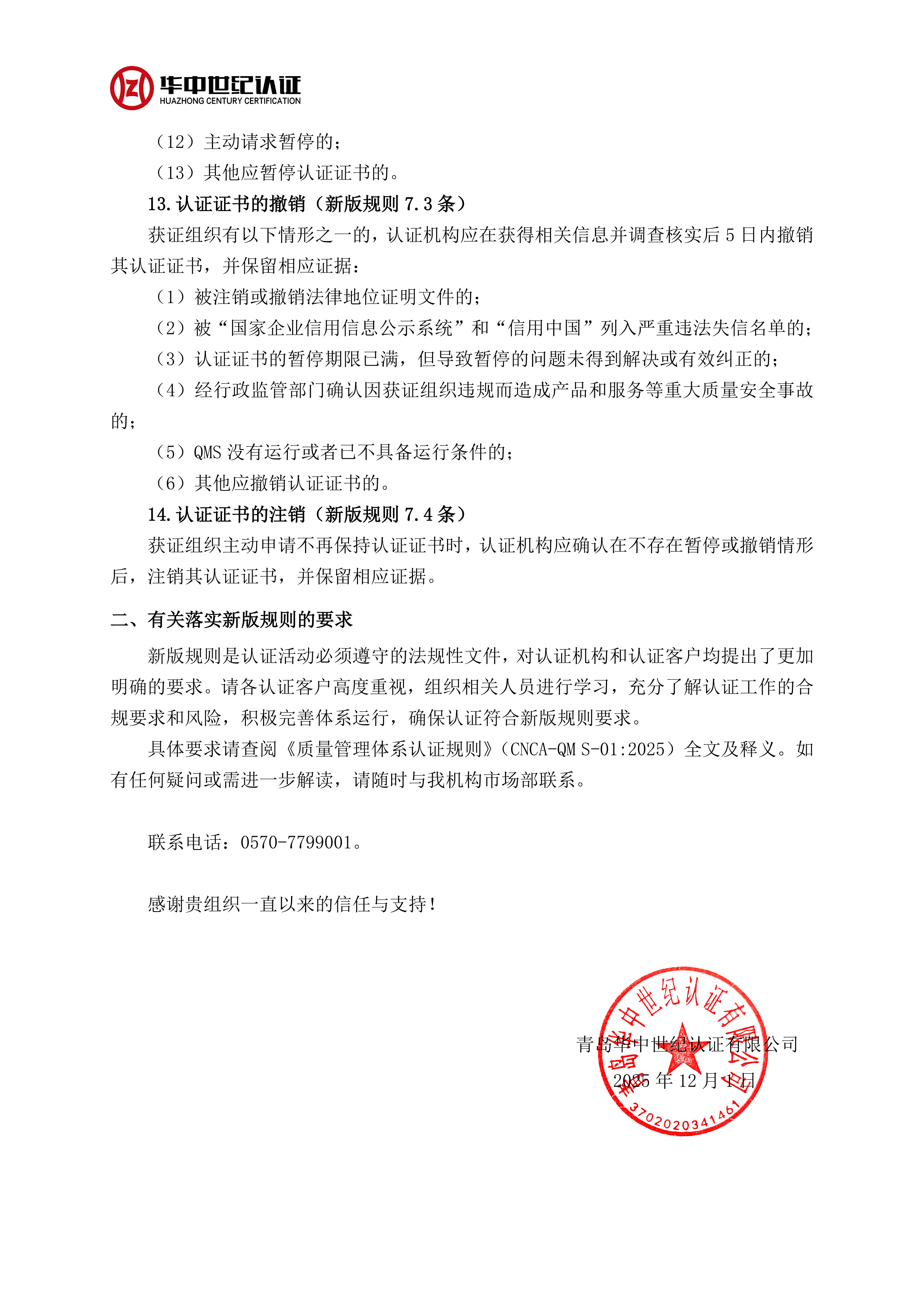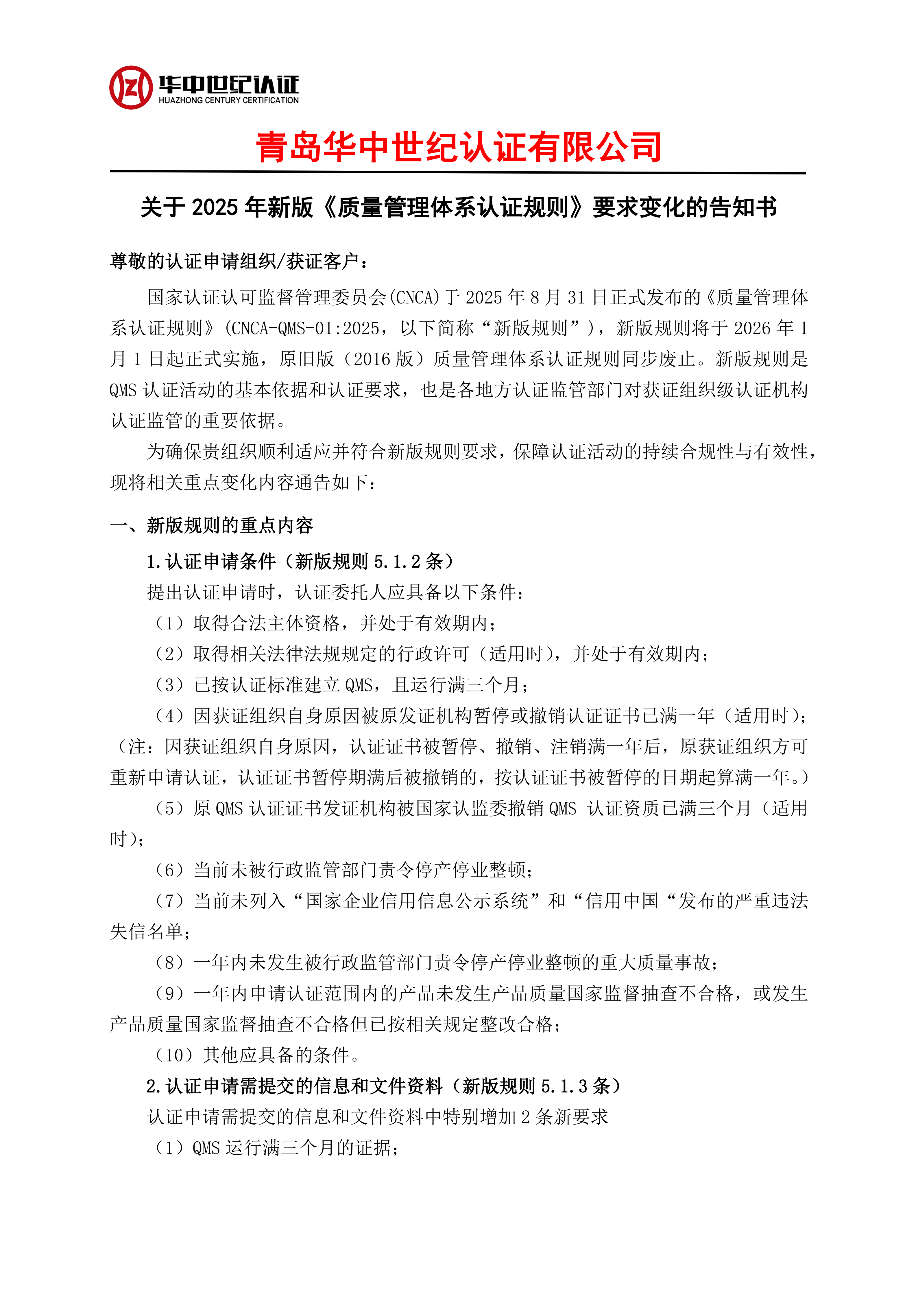 关于2025年新版《质量管理体系认证规则》要求变化的告知书